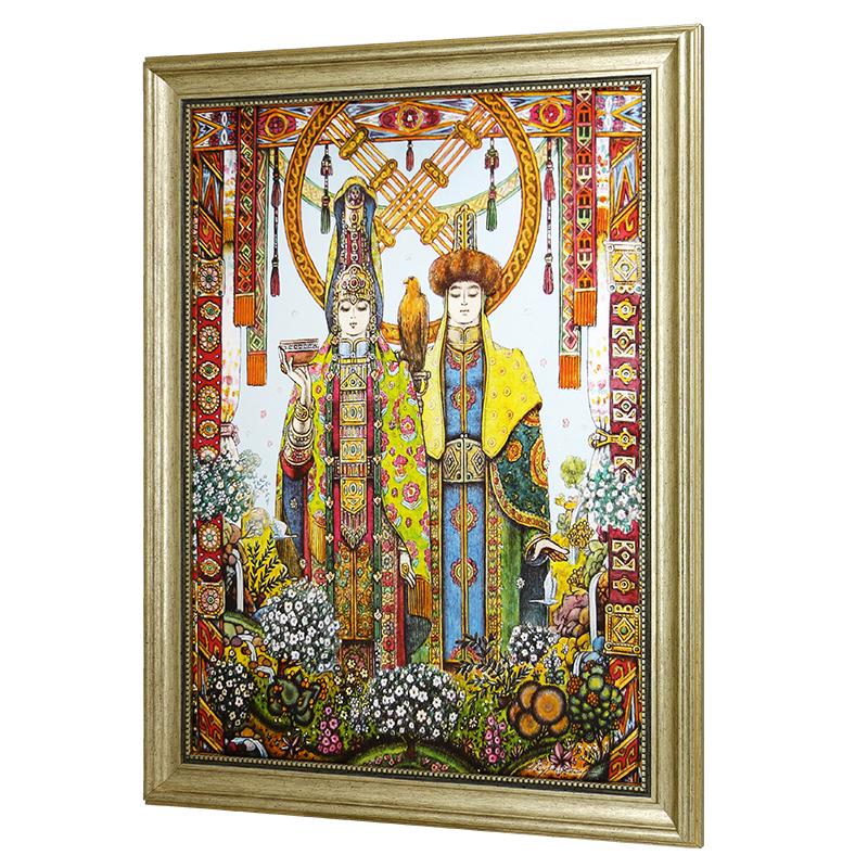 • A subtle connoisseur of Kazakh traditions, an honored master Agymsaly Dyuzelkhanov skillfully presented the main symbols of family well-being in one picture. The marvellous shanyrak points to the continuity of generations; the hunting golden eagle epitomizes the heavenly powers. Decorative elements of the yurt in the form of tassels were considered in the old days as protection from evil spirits; while the ornament on the belts of men and women symbolizes abundance. "Berekeli Shanyrak" panel will express the warmest wishes of prosperity to every family more eloquently than any words.