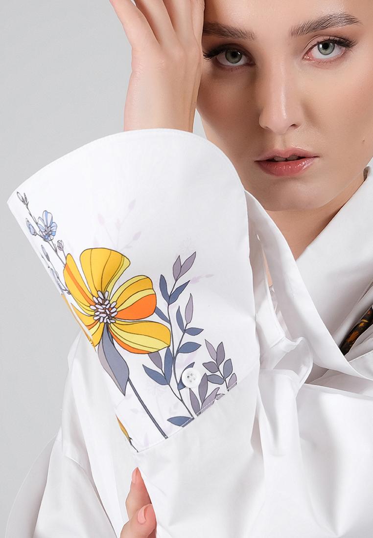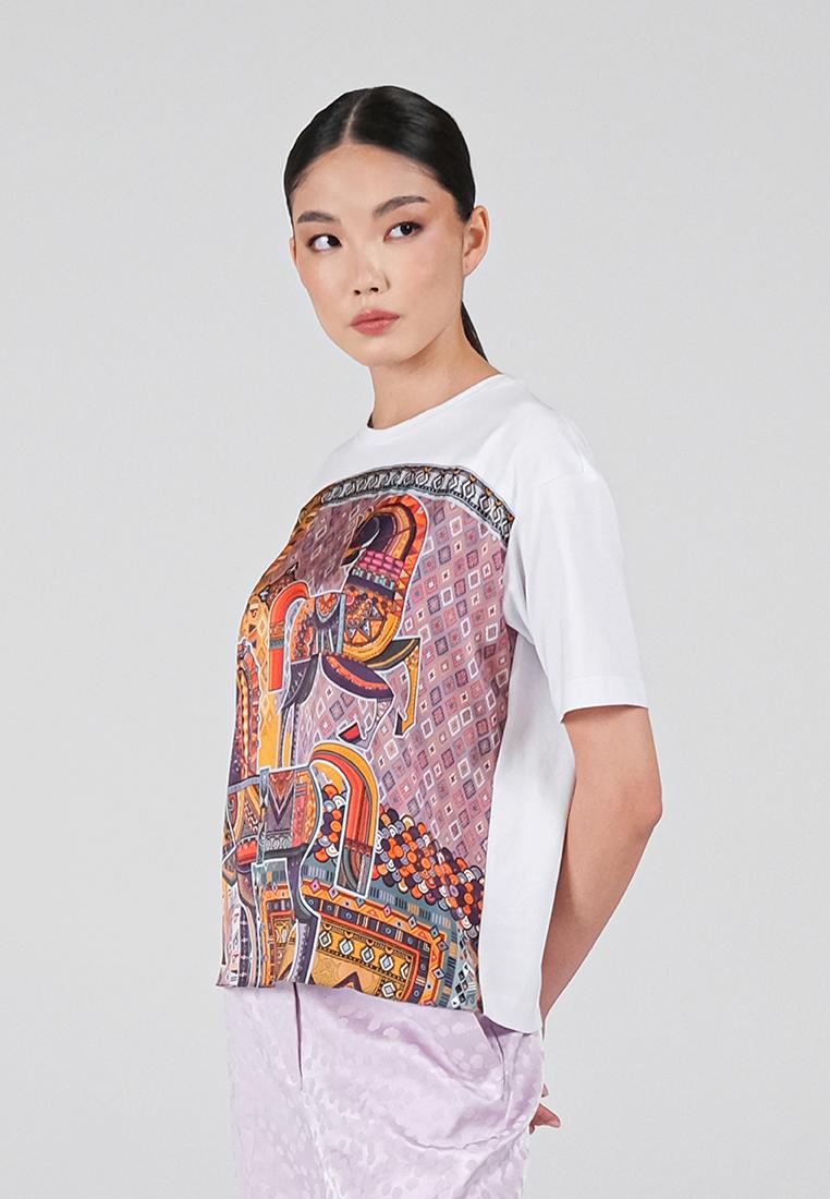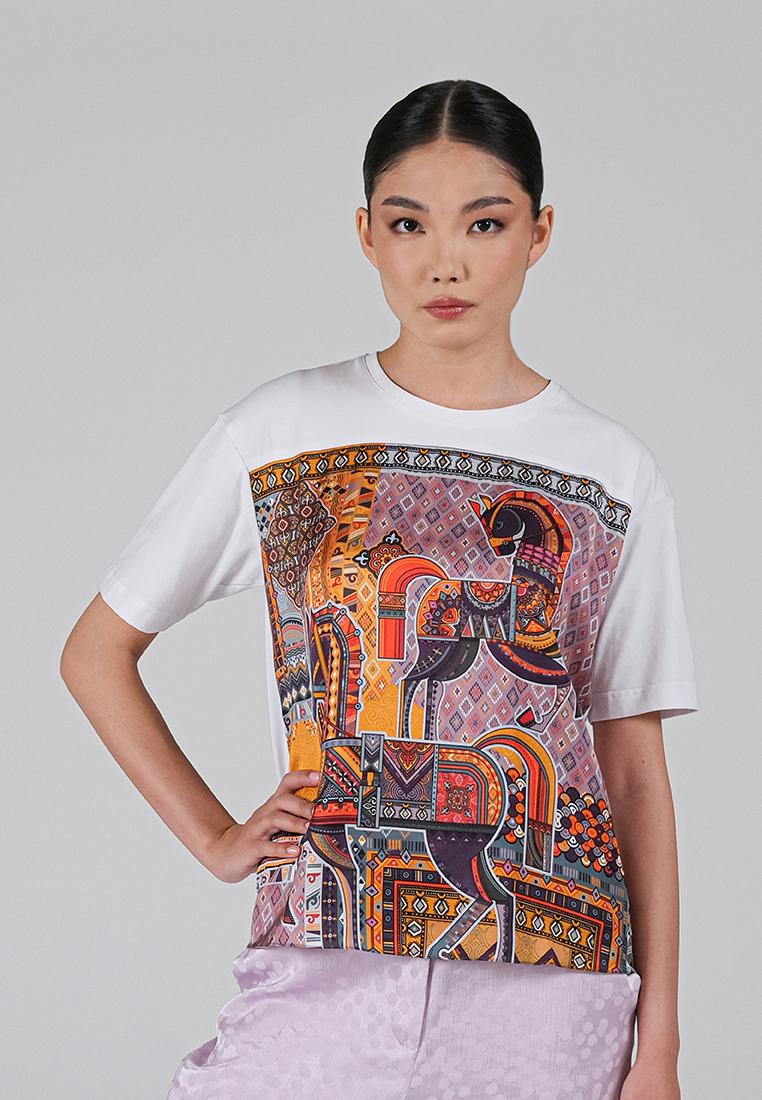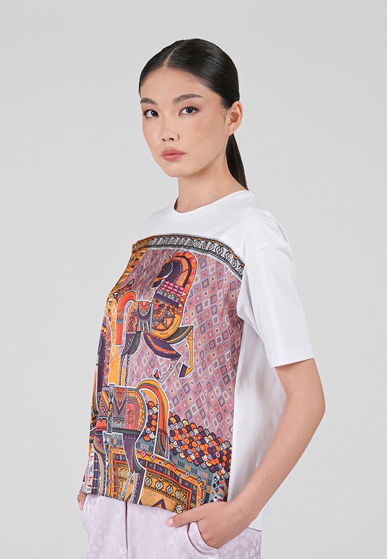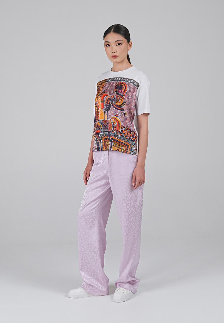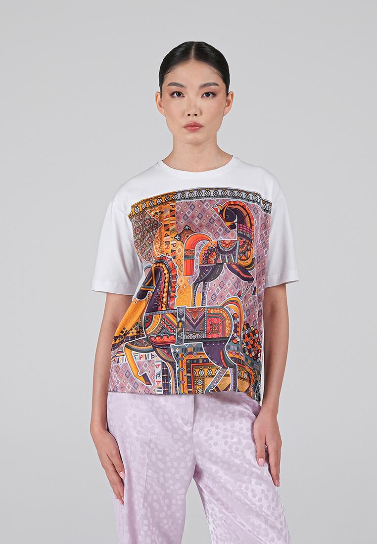 • Классическая футболка сочетает комфорт и изысканный дизайн. Спинка и рукава выполнены из мягкой кулирки — натурального хлопка с добавлением лайкры, благодаря чему ткань дышит, остаётся гладкой и приятной к телу. Передняя часть изготовлена из итальянской вискозы с шелковистой фактурой и украшена оригинальным принтом, вдохновлённым мотивами коллекции.