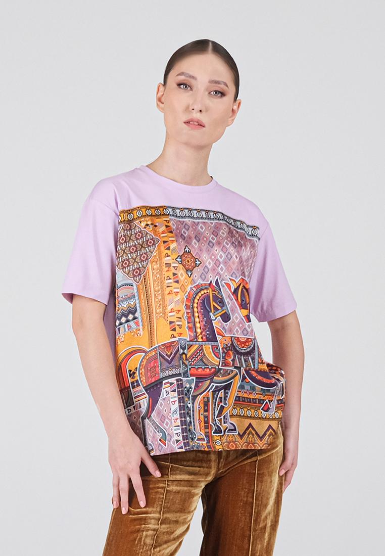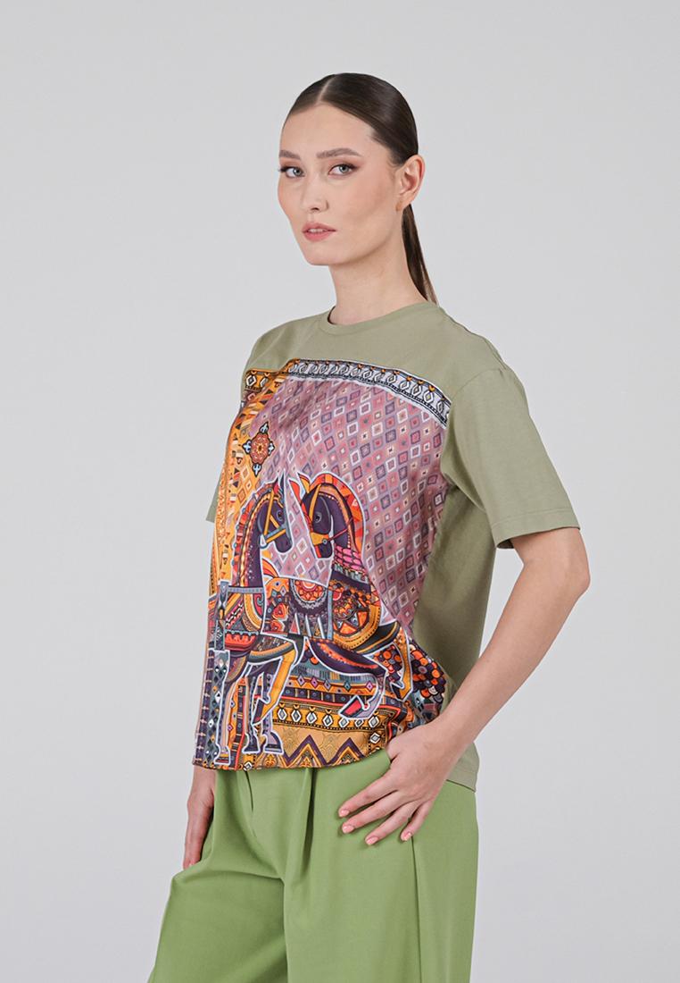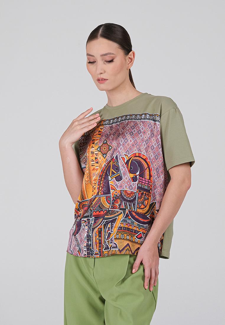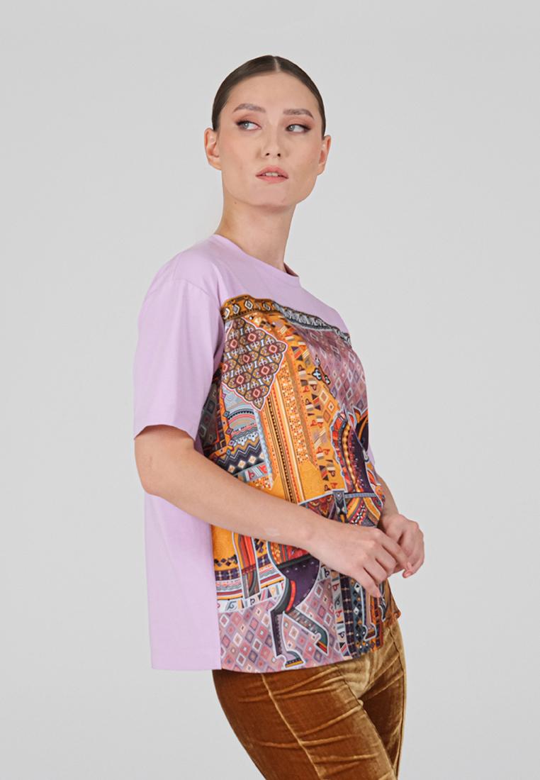 • Классическая футболка сочетает комфорт и изысканный дизайн. Спинка и рукава выполнены из мягкой кулирки — натурального хлопка с добавлением лайкры, благодаря чему ткань дышит, остаётся гладкой и приятной к телу. Передняя часть изготовлена из итальянской вискозы с шелковистой фактурой и украшена оригинальным принтом, вдохновлённым мотивами коллекции.