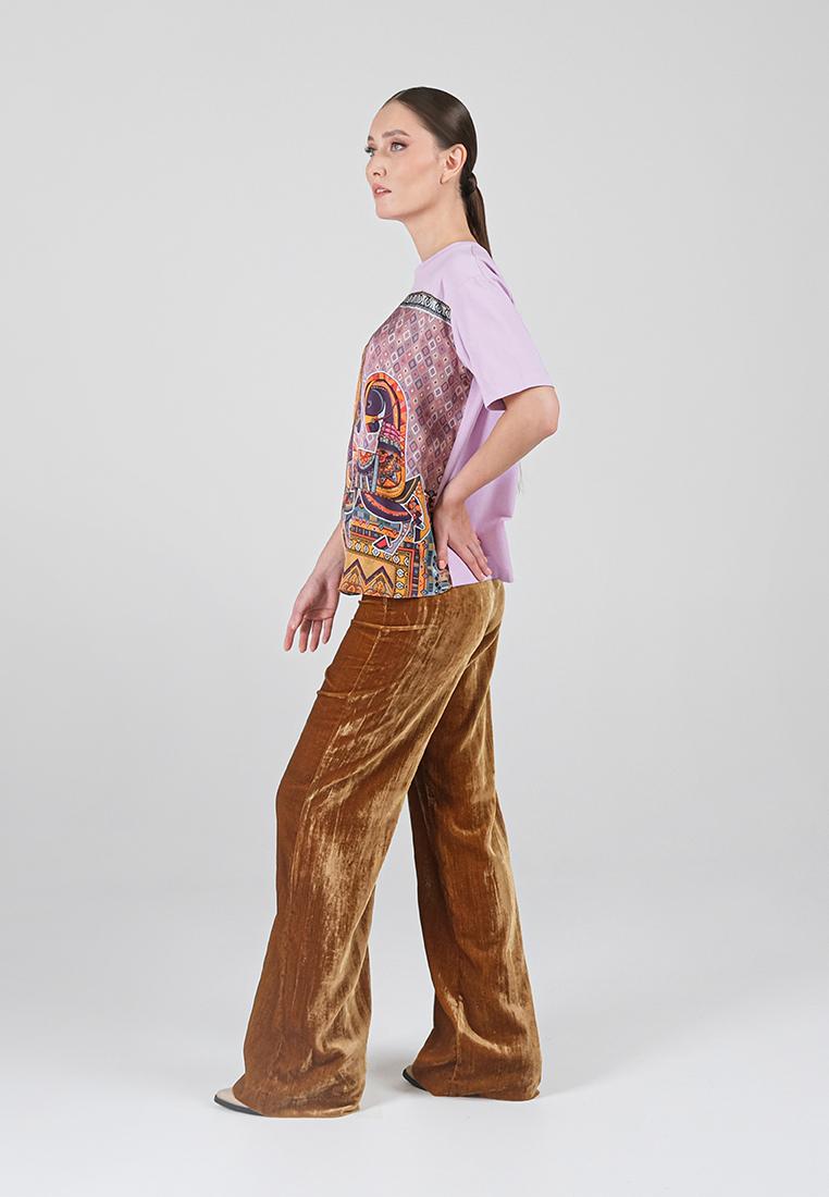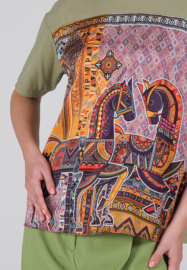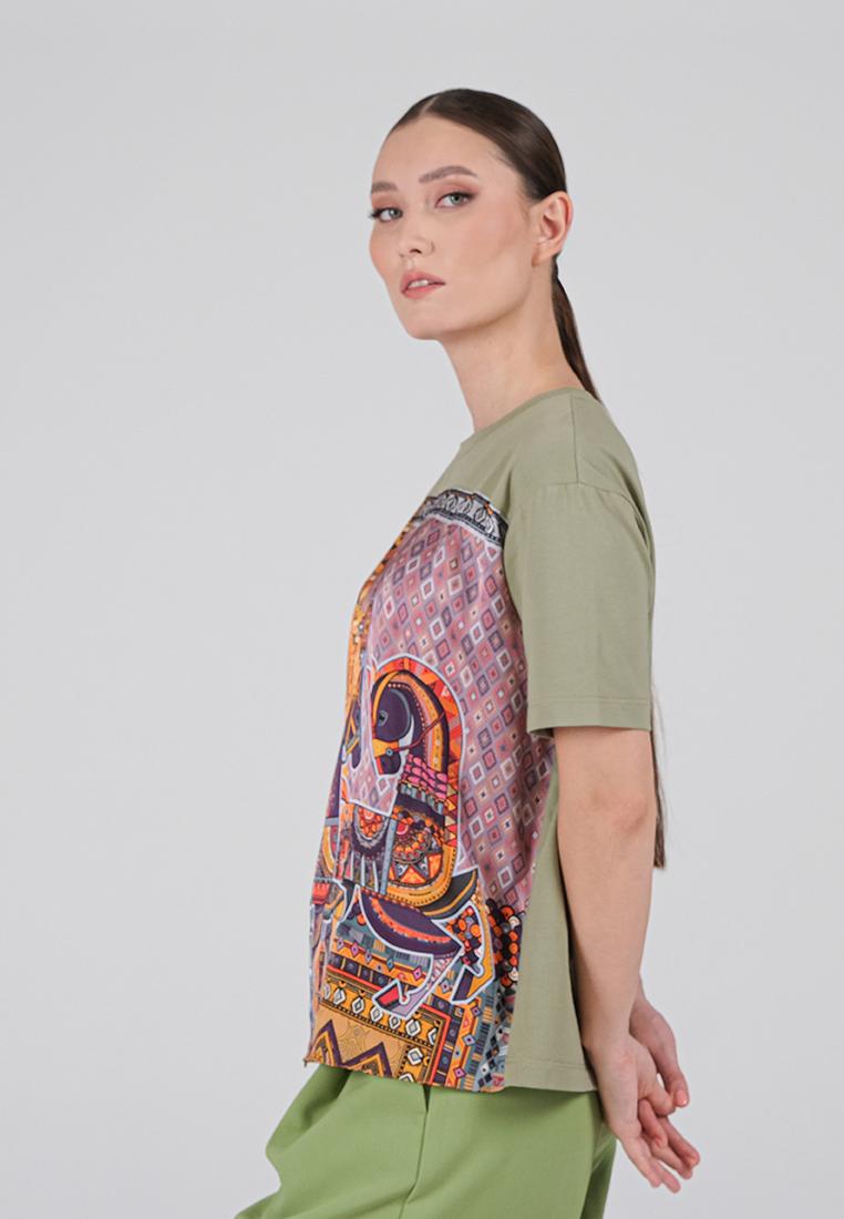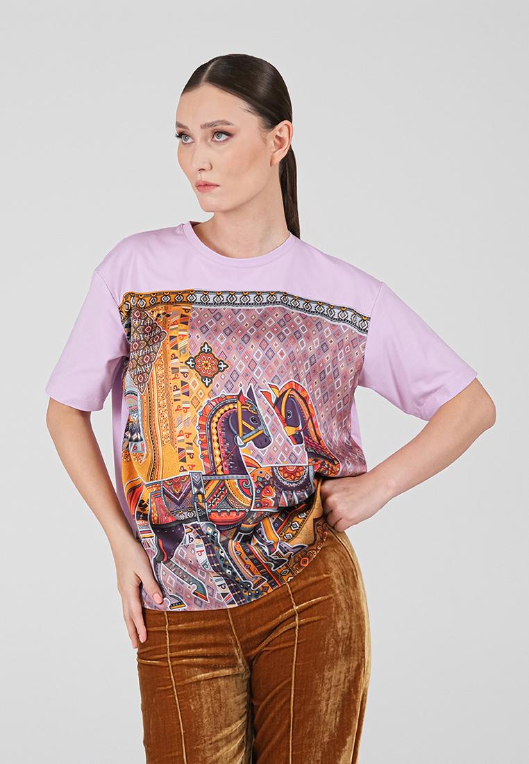 • Классическая футболка сочетает комфорт и изысканный дизайн. Спинка и рукава выполнены из мягкой кулирки — натурального хлопка с добавлением лайкры, благодаря чему ткань дышит, остаётся гладкой и приятной к телу. Передняя часть изготовлена из итальянской вискозы с шелковистой фактурой и украшена оригинальным принтом, вдохновлённым мотивами коллекции.