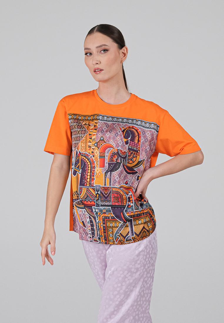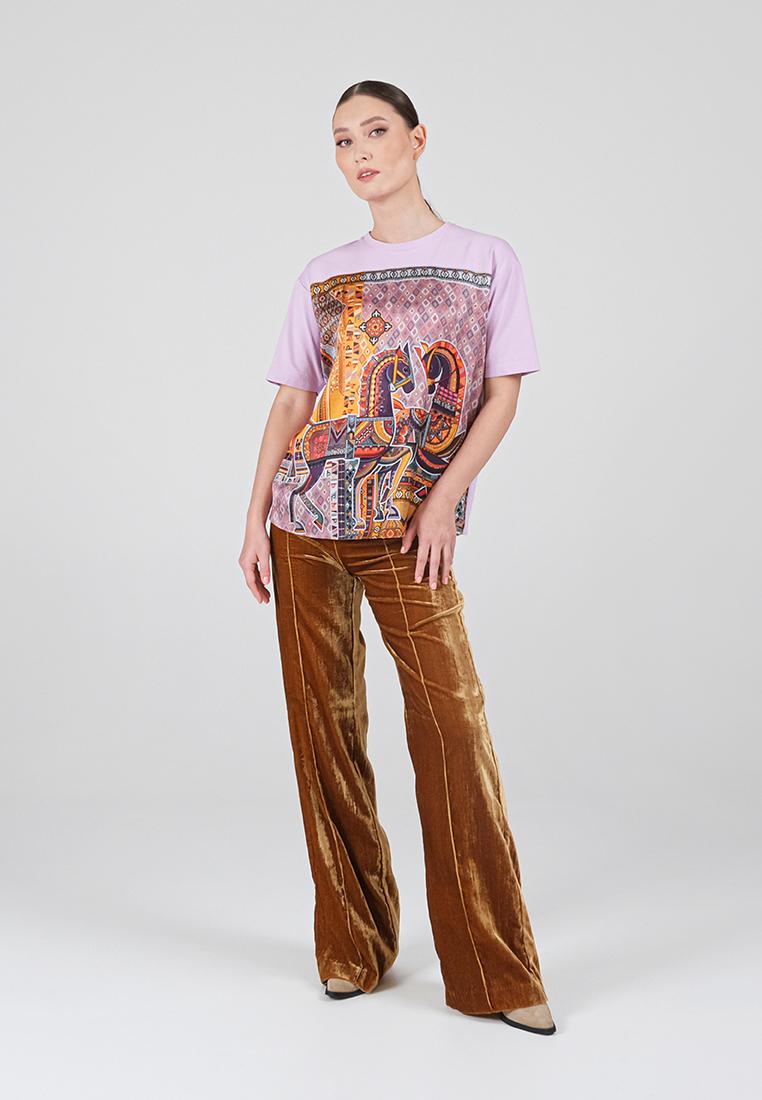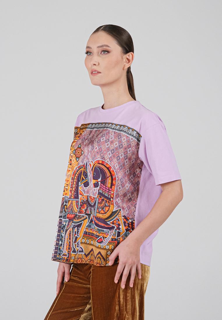 • Классическая футболка сочетает комфорт и изысканный дизайн. Спинка и рукава выполнены из мягкой кулирки — натурального хлопка с добавлением лайкры, благодаря чему ткань дышит, остаётся гладкой и приятной к телу. Передняя часть изготовлена из итальянской вискозы с шелковистой фактурой и украшена оригинальным принтом, вдохновлённым мотивами коллекции.